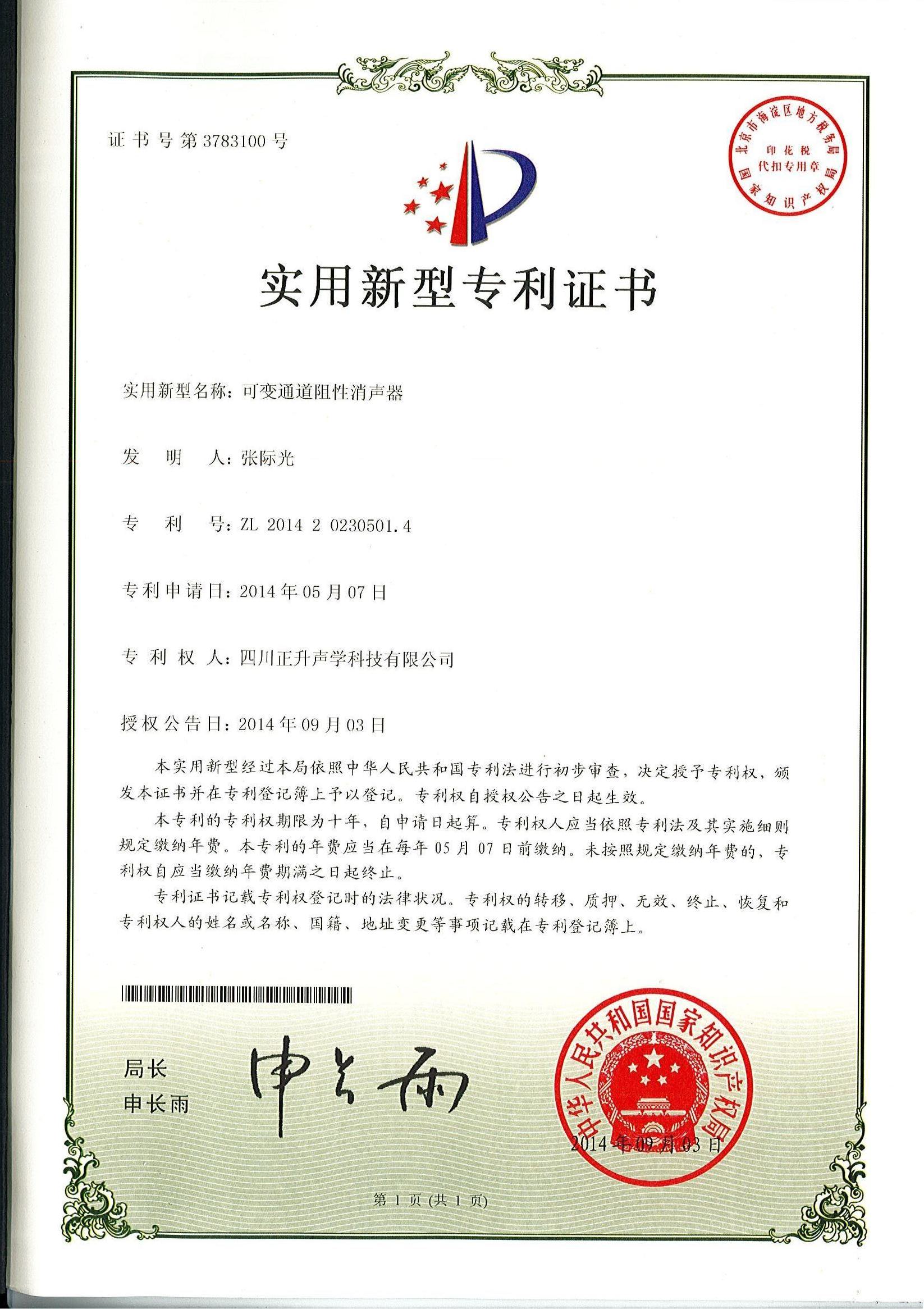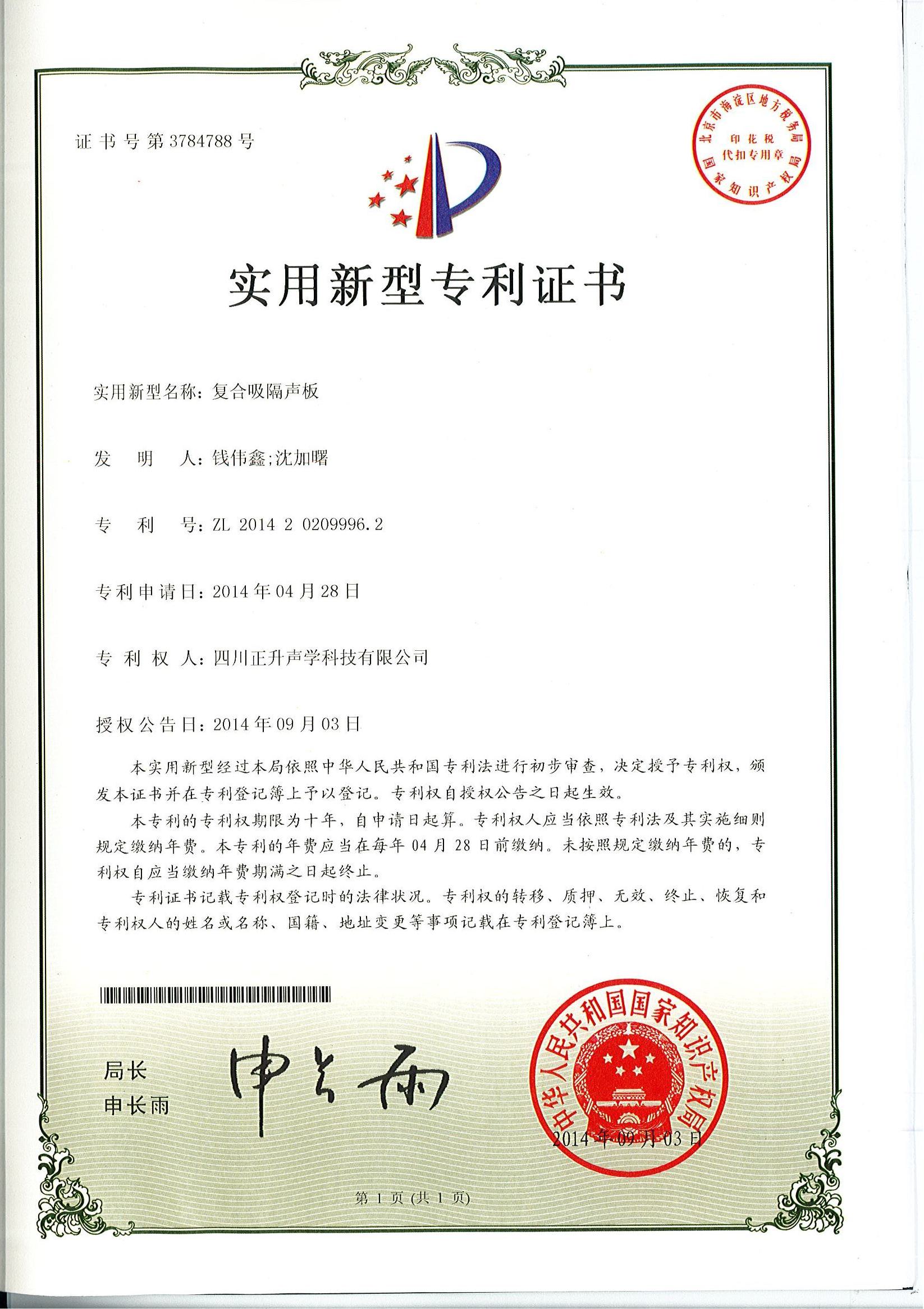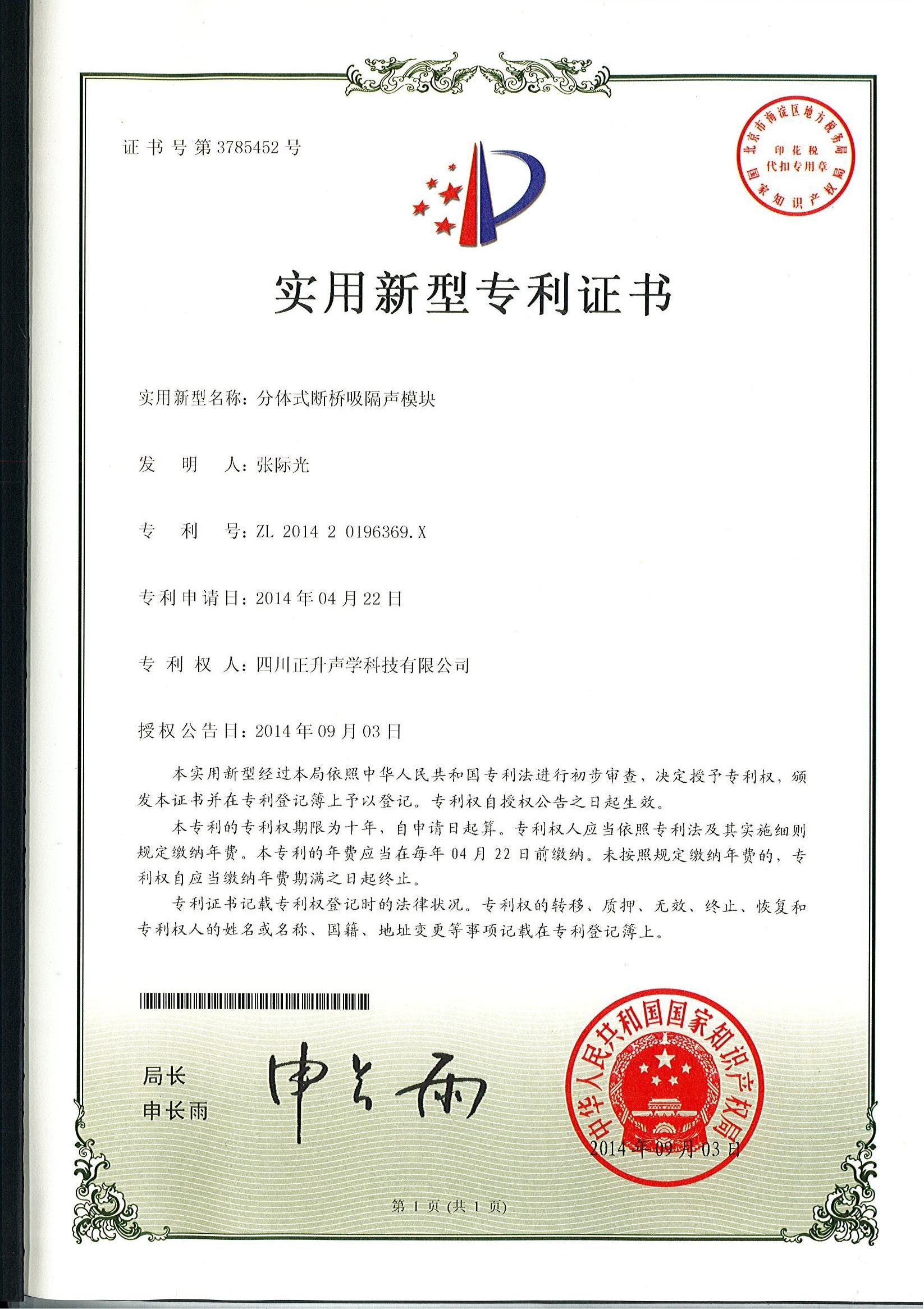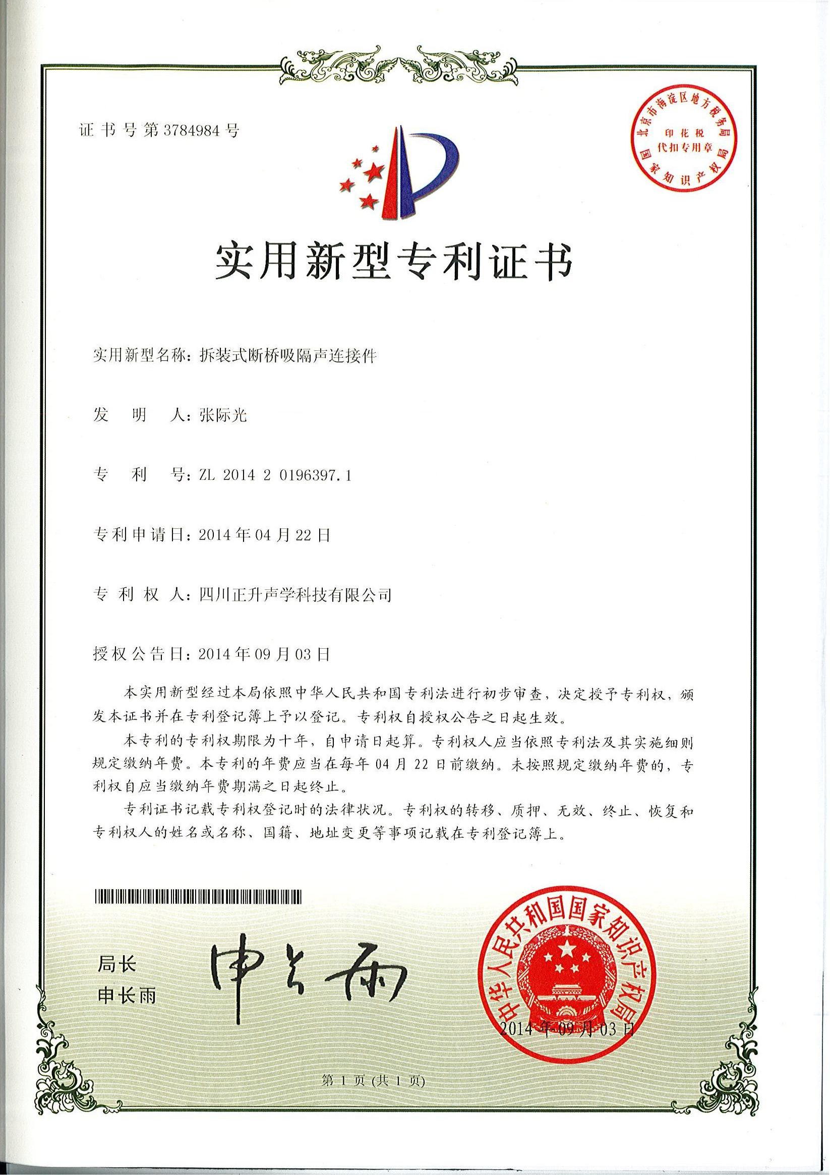 熱烈祝賀公司拆裝式斷橋吸隔聲連接件、分體式斷橋吸隔聲模塊、復(fù)合吸隔聲板、可變通道阻性消聲器等實(shí)用新型專利授權(quán)且頒發(fā)證書。